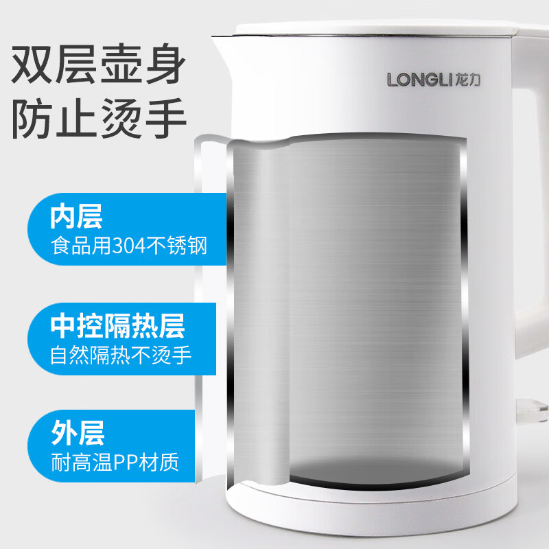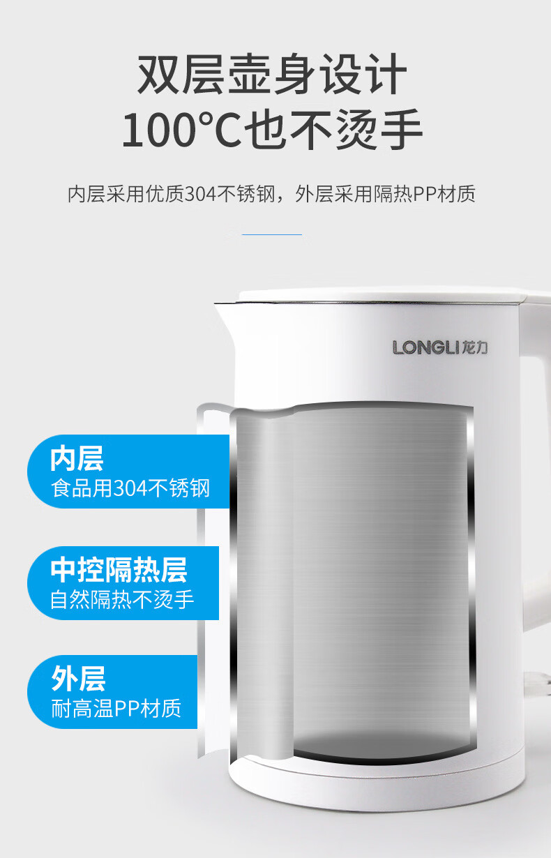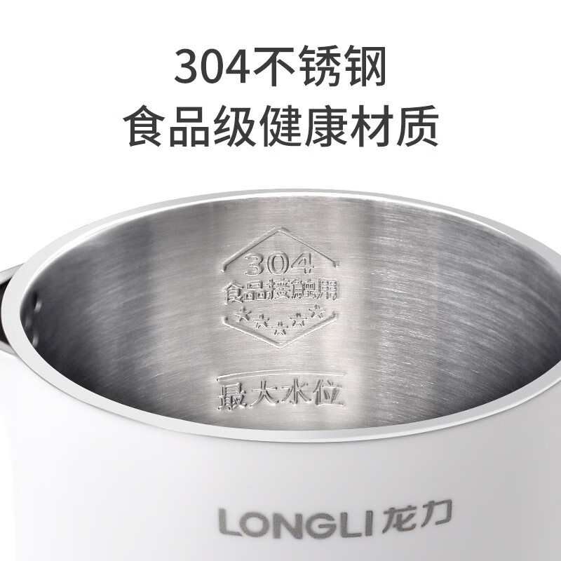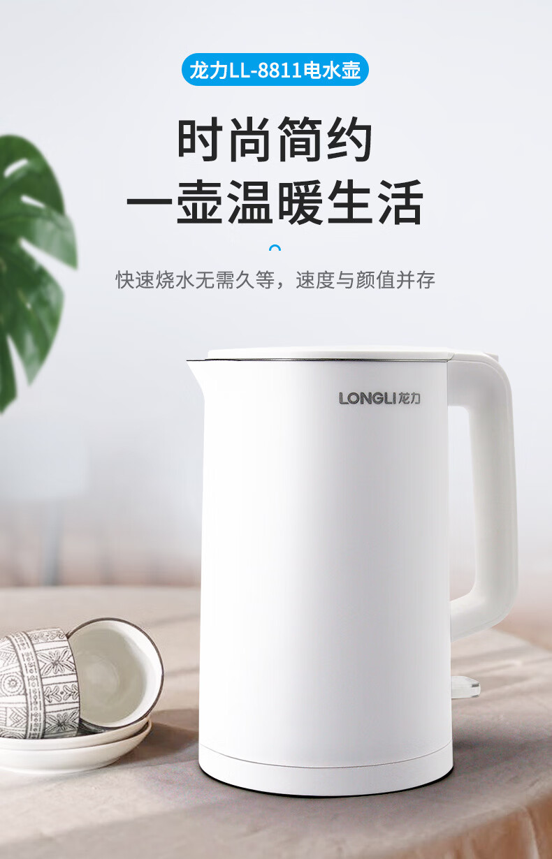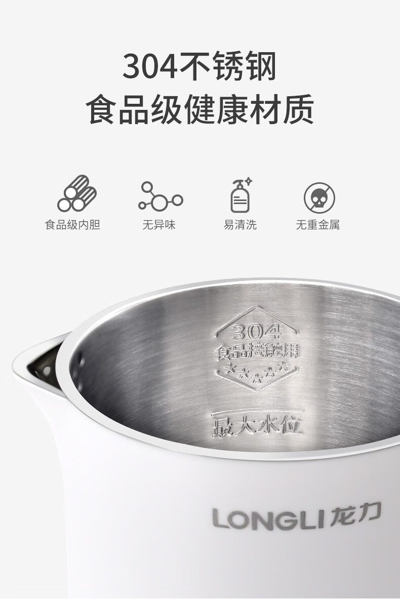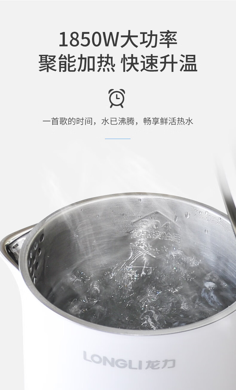 龙力LL-8811电热水壶304不锈钢烧水壶家用酒店宾馆办公室1.8L水壶 白色 自营